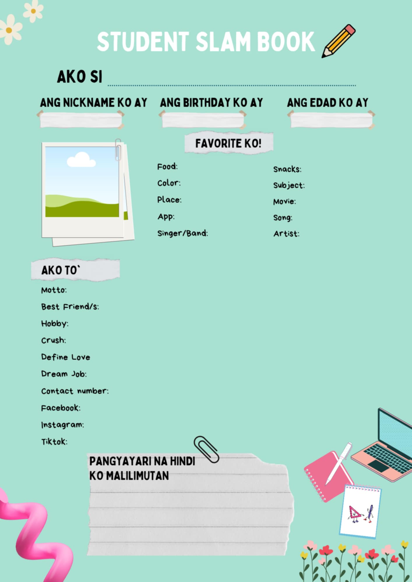 WHAT'S WITH THE PRODUCT?Slam book often features a variety of questions about individual or their friends.It's a fun way to connect with friends or schoolmates and share personal stories.Preview Sample Template